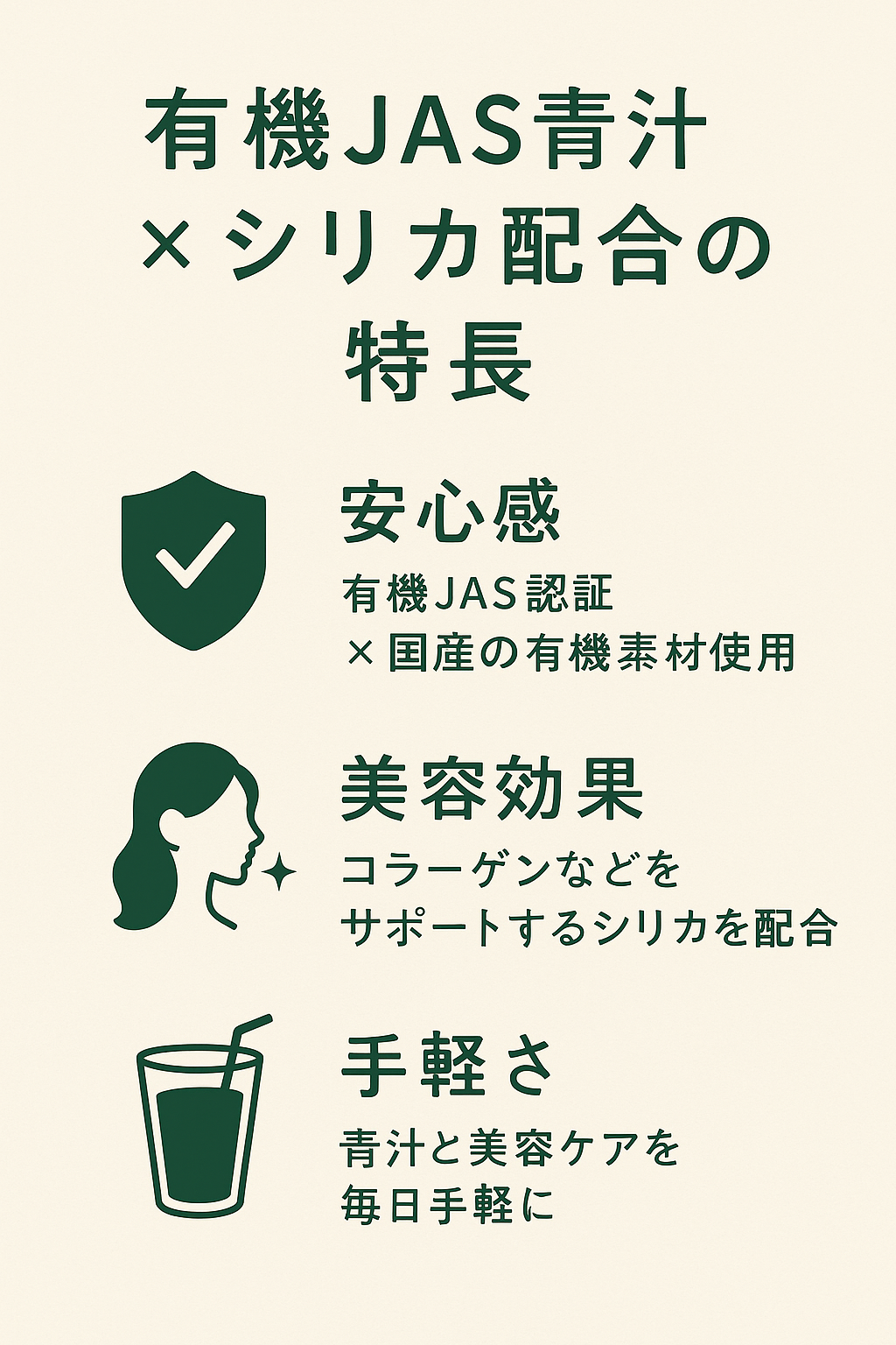 有機青汁シリカ(美容青汁)は、オーガニック素材にこだわった“飲む美容習慣”です。