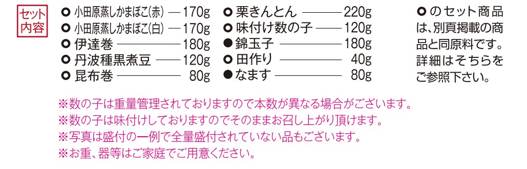 和風お重セットの中から代表的な品を詰め合わせました。一品ずつ素材の風味を活かした飽きのこない味付けです。冷蔵品のため解凍いらずで、ご家庭でお好みの器にお好きな品を盛付け、楽しみながらお召し上がりいただけます。