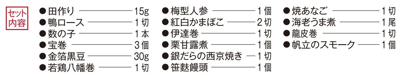 小懐石おせち三段重をベースに、この商品だけのオリジナル品も盛り込みました。今年一年がんばった「あなた」や「あの人」にお贈りする、ちょっと贅沢な一段重です。良い年をお迎えください。