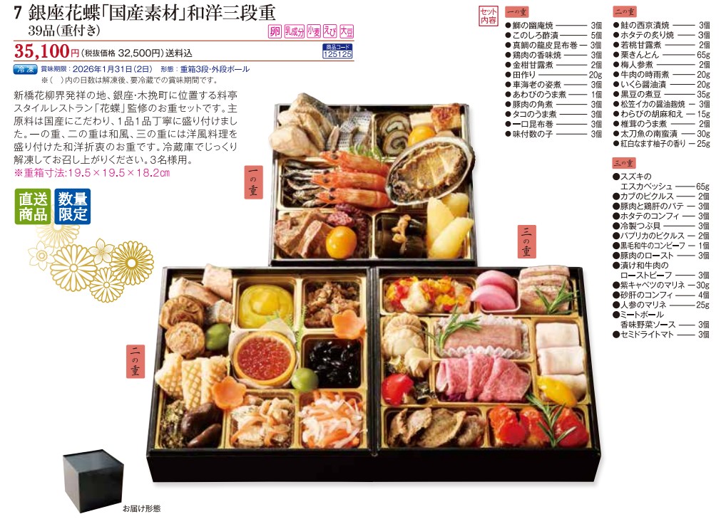 › 【数量限定】7.銀座花蝶「国産素材」和洋三段重39品(お重付)/12月30日お届け